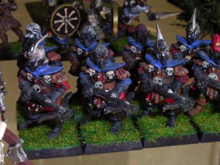 The basic color for my dark elves are red, blue and black. I don't know if anyone else paints his dark elves with black skin, but I do.